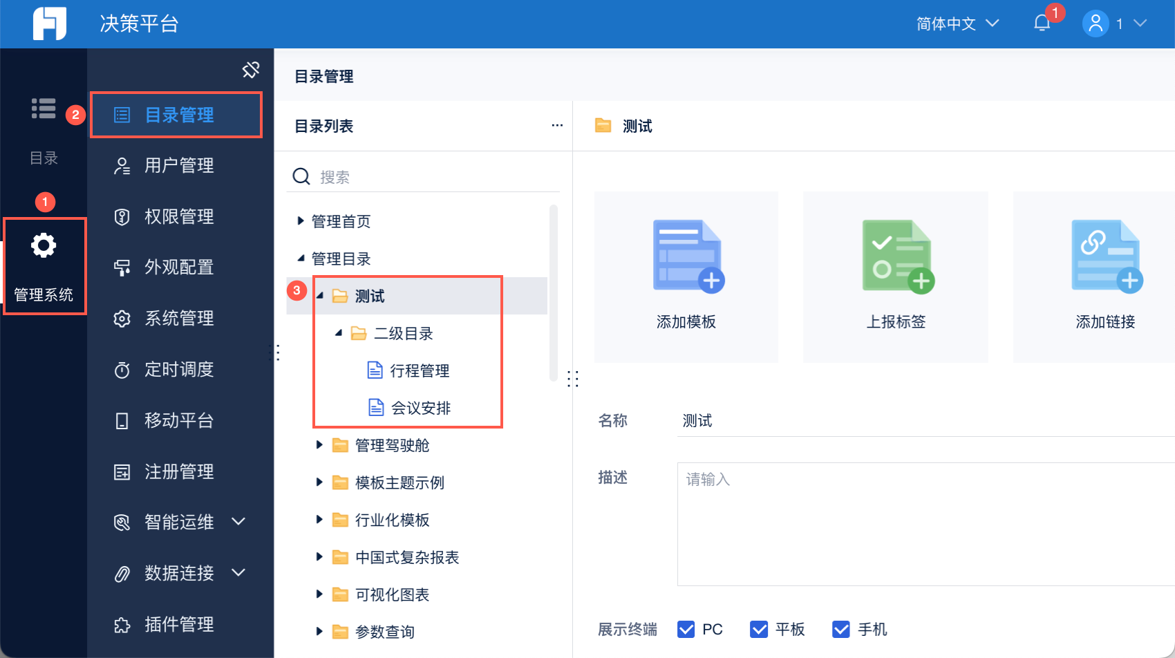 管理员登录数据决策系统,点击「管理系统>目录管理」,添加目录及模板,详情操作步骤请参考:添加目录