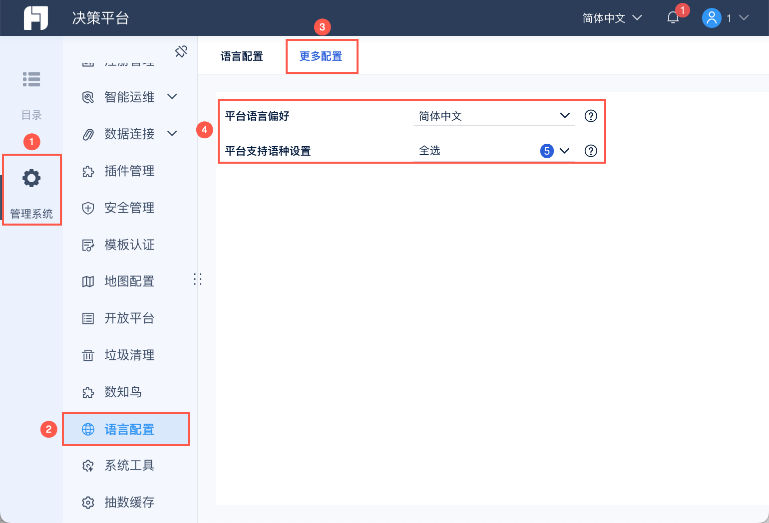 管理员登录决策系统,点击「管理系统>语言配置>更多配置」,即可进入系统语言偏好设置,如下图所示: