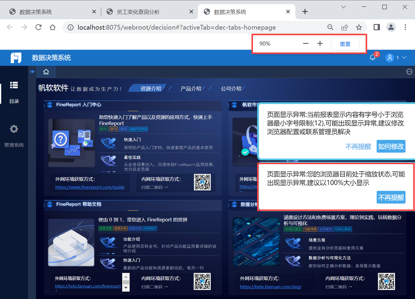 11.0.3 及之后版本的工程,新增「报表检测」功能。对终端用户进行提示,引导用户调整到适合预览的缩放效果。