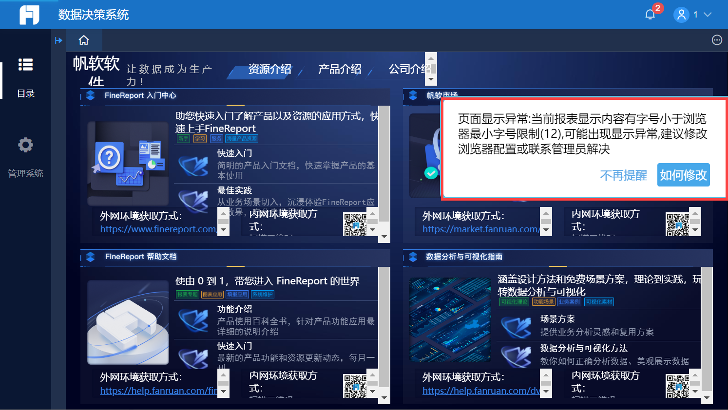 当用户在浏览器端预览模板时,弹出提示框「页面显示异常:当前报表显示内容有字号小于浏览器最小字号限制(12),可能出现显示异常,建议修改浏览器配置或联系管理员解决」。如下图所示: