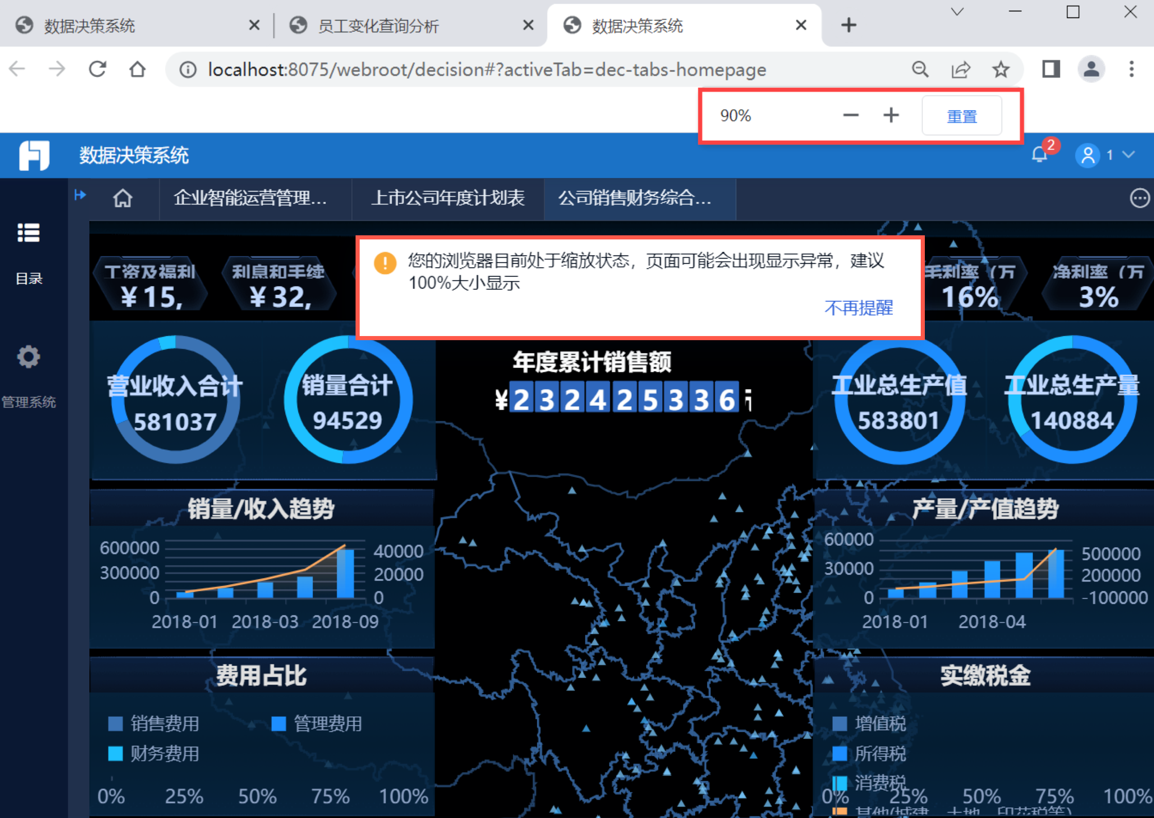 若预览的模板为未使用「新计算引擎」的普通报表或使用了「旧版决策报表」模式的决策报表,浏览器窗口缩放非100%时,则弹窗提示「页面显示异常:您的浏览器目前处于缩放状态,可能出现显示异常,建议以100%大小显示」。如下图所示: