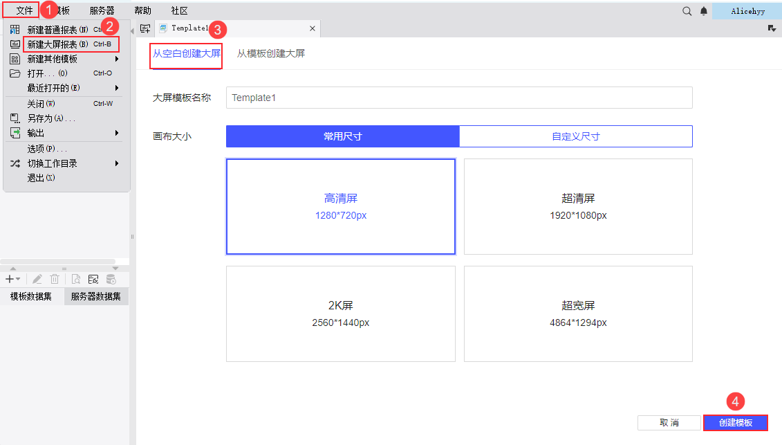 点击设计器左上角「文件>新建大屏报表>从空白创建大屏」,可自定义名称和尺寸。如下图所示: