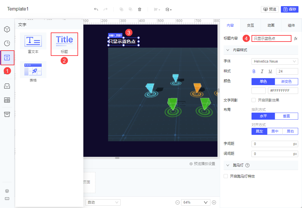 添加一个标题组件,组件内容为「只显示蓝色点」。如下图所示: