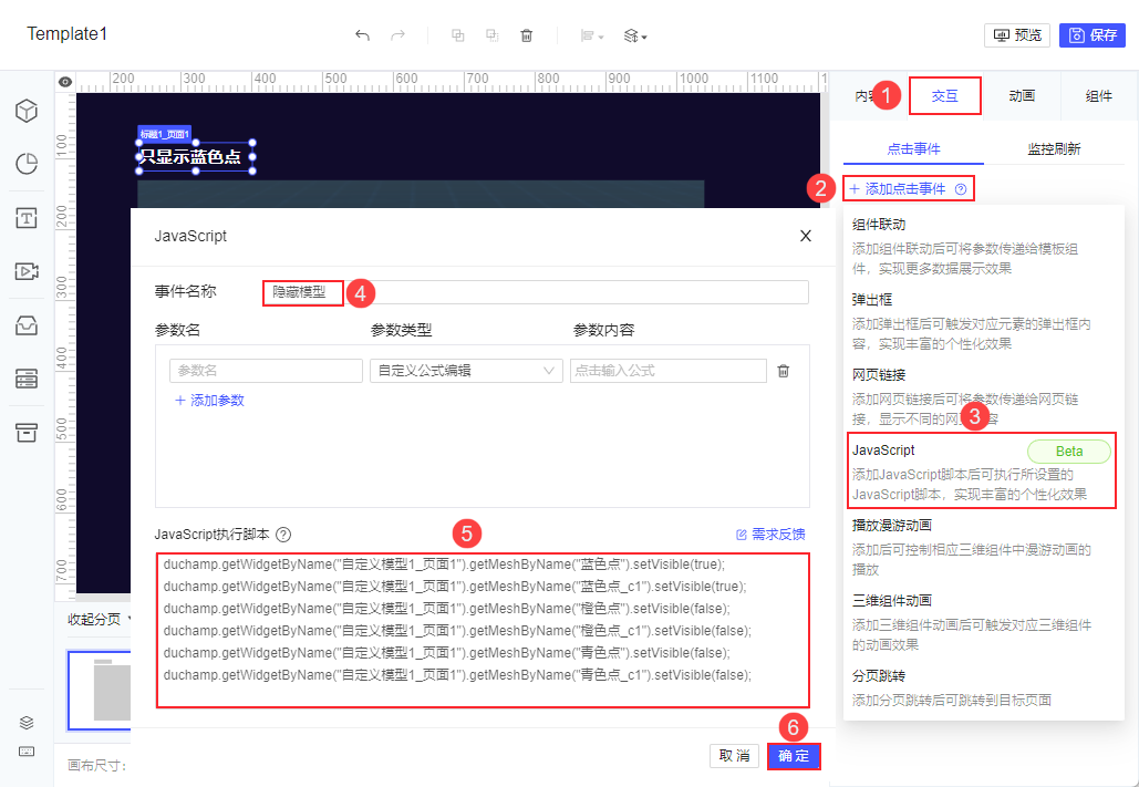 duchamp.getWidgetByName("自定义模型1_页面1").getMeshByName("蓝色点").setVisible(true); //true表示可见