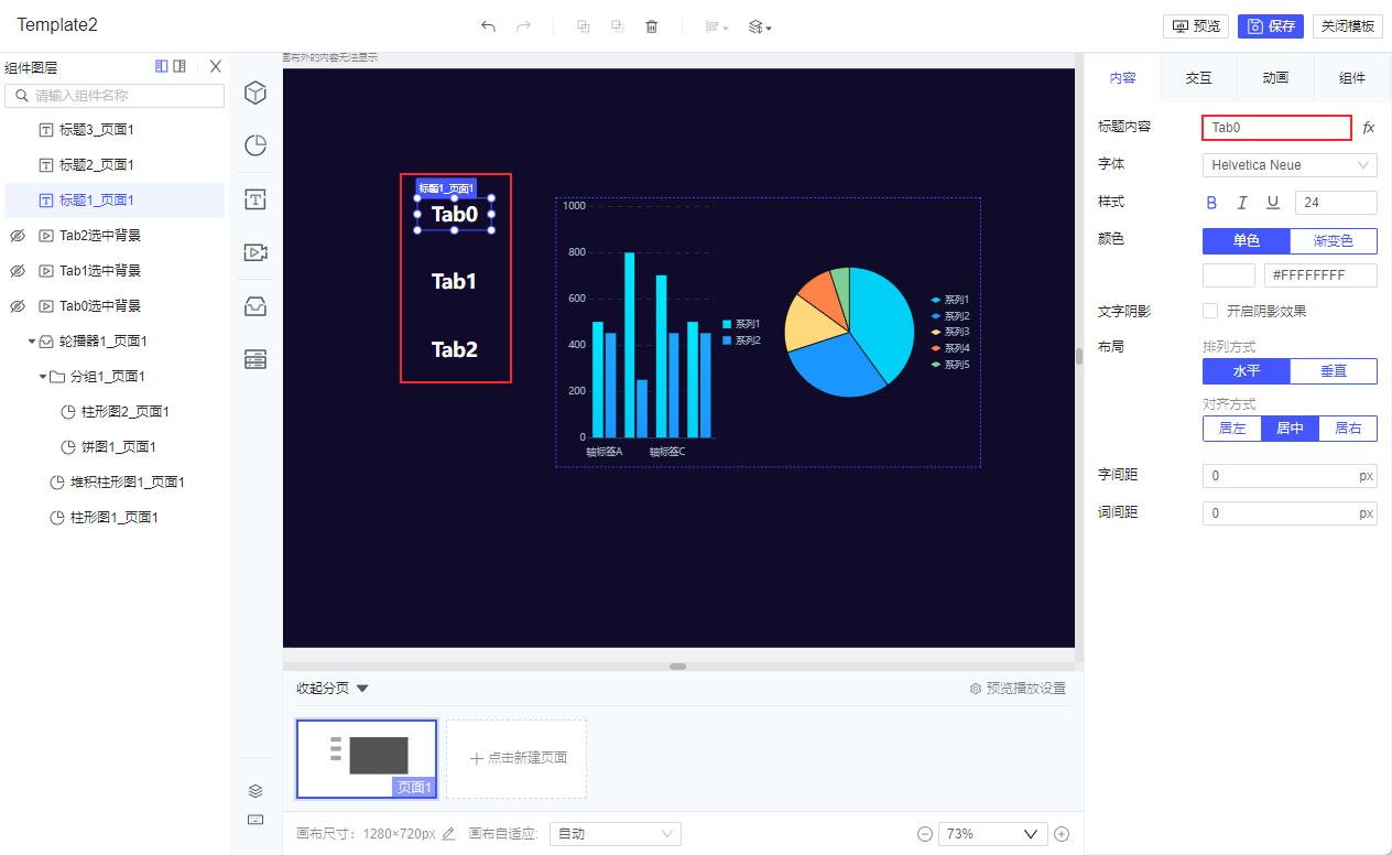1)上述步骤中,轮播器根据拖入的组件和组合默认生成了 3 个 Tab 页,因此我们需要添加 3 个标题组件,内容分别设置为「Tab0、Tab1、Tab2」。