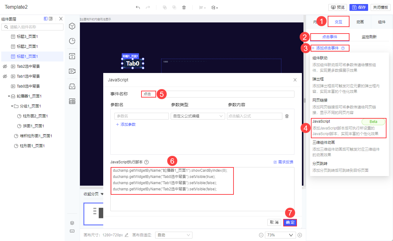 选中「Tab0」标题组件,点击「交互>点击事件>添加点击事件>JavaScript」,在弹出框中设置事件名称,输入 JavaScript 脚本: