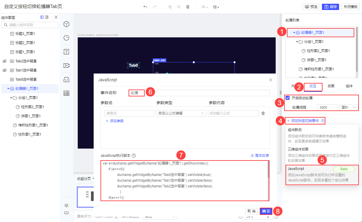 就以上述示例为例,开启自动轮播,将轮播间隔设置为 3000 毫秒,点击「添加标签切换事件>JavaScript」,输入 JavaScript 脚本: