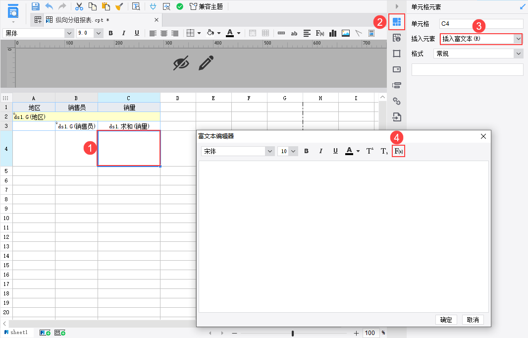 1)在 C4 单元格中把地区和销量总和进行拼接并设置不同样式。在 C4 单元格中插入富文本,选择公式,如下图所示: