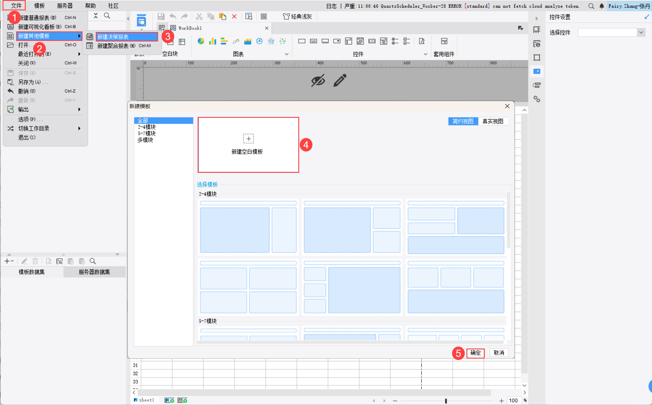 1)打开 FineReport 设计器,点击菜单栏「文件>新建其他模板>新建决策报表」,点击「新建空白模板」,点击「确定」,如下图所示: