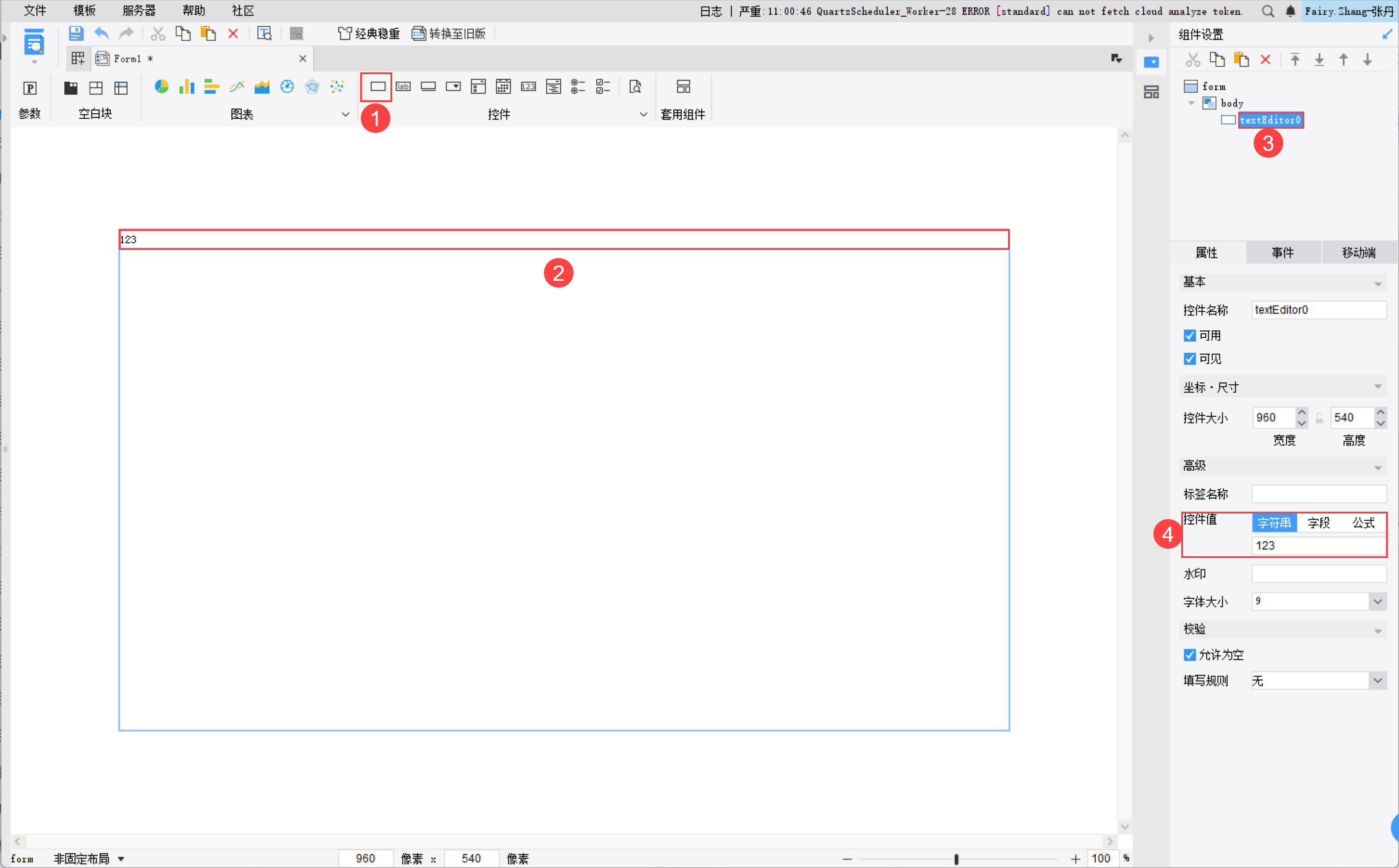 3)将控件中的「文本控件」拖入空白画布中,如下图所示: