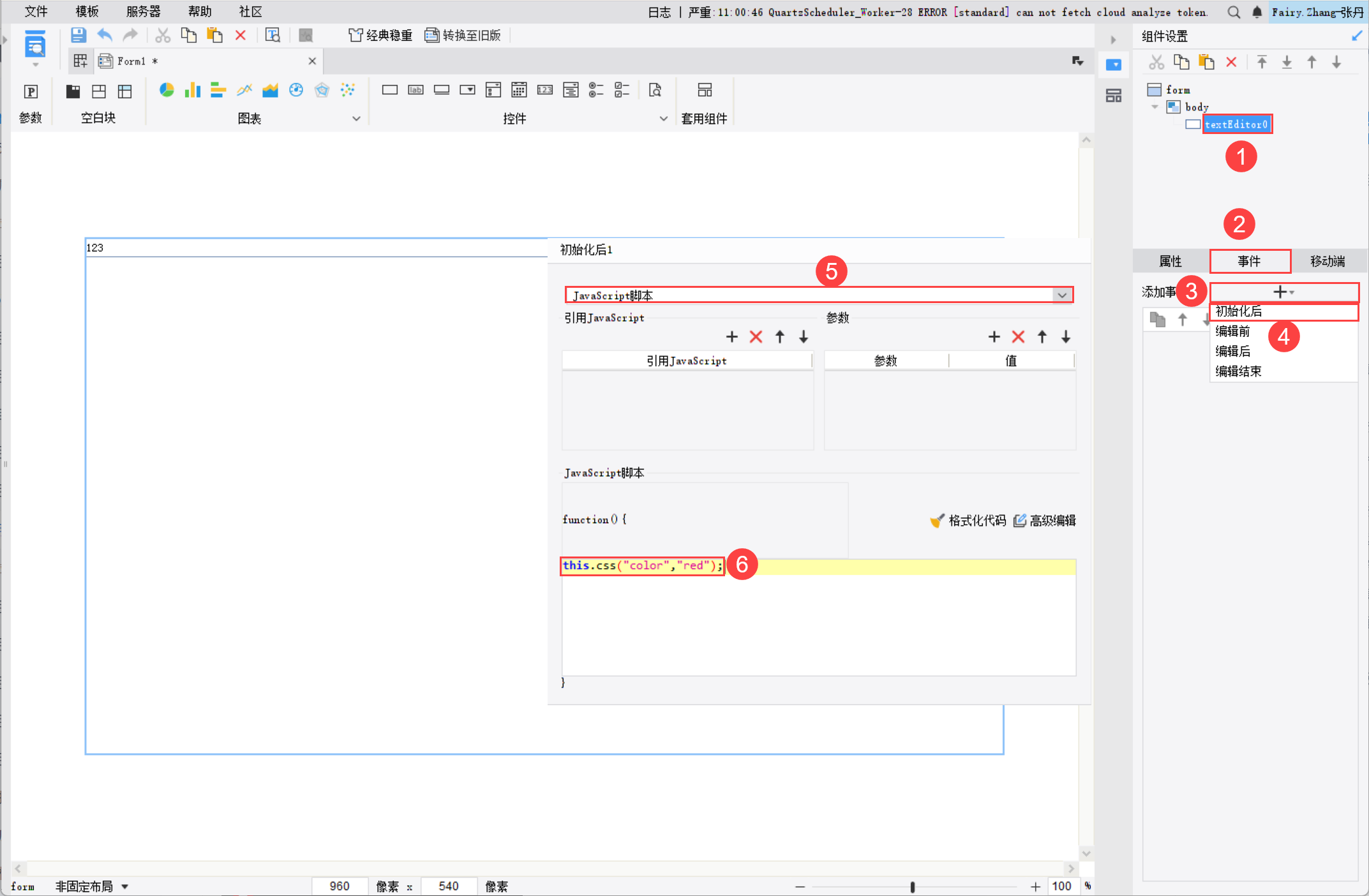 1)在右侧「属性面板」中选中「文本控件」,点击「事件」,点击「+」,添加「初始化后」事件,如下图所示: