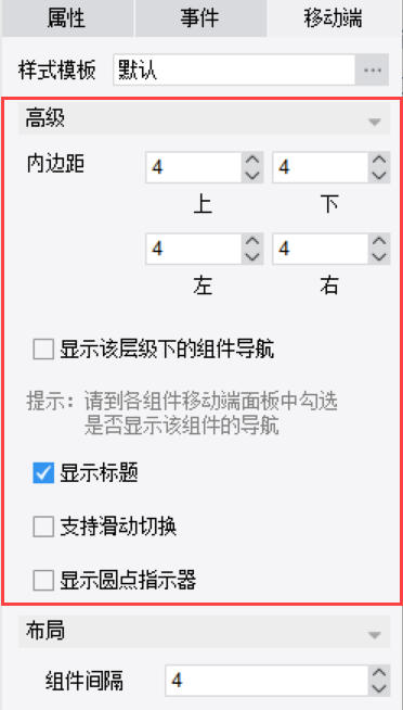 移动端面板布局属性的界面如下图所示,支持设置组件间隔,默认为 4 。
