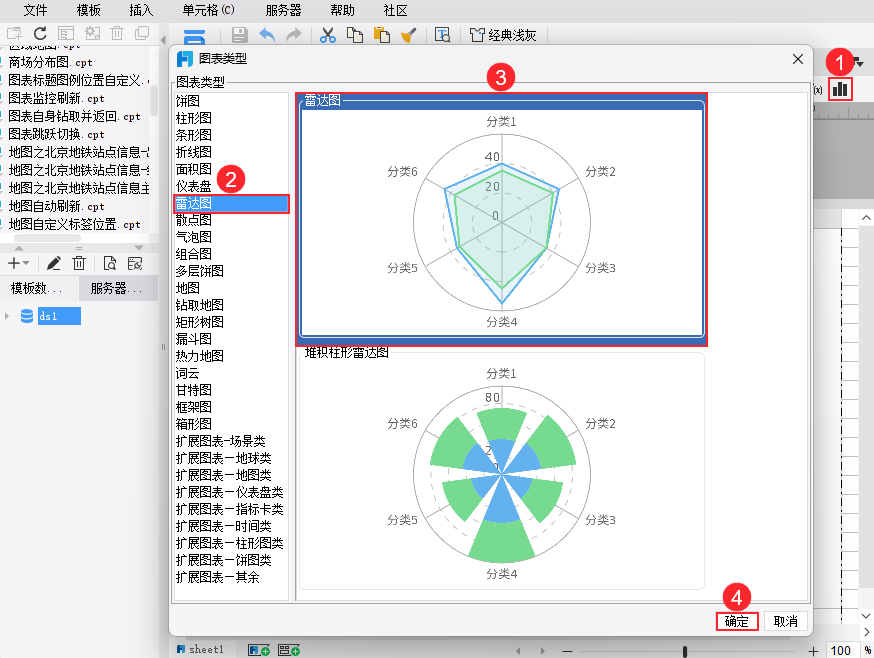1)前两 个图表绑定数据的方法是一致的,如下图所示: