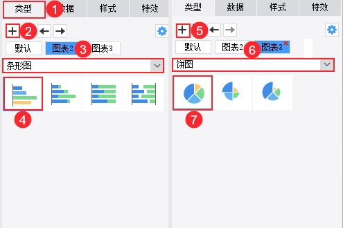 2)点击「+」新增 2 个图表:「图表2」和「图表3」,图表2类型选择「条形图」,图表3类型选择「饼图」。