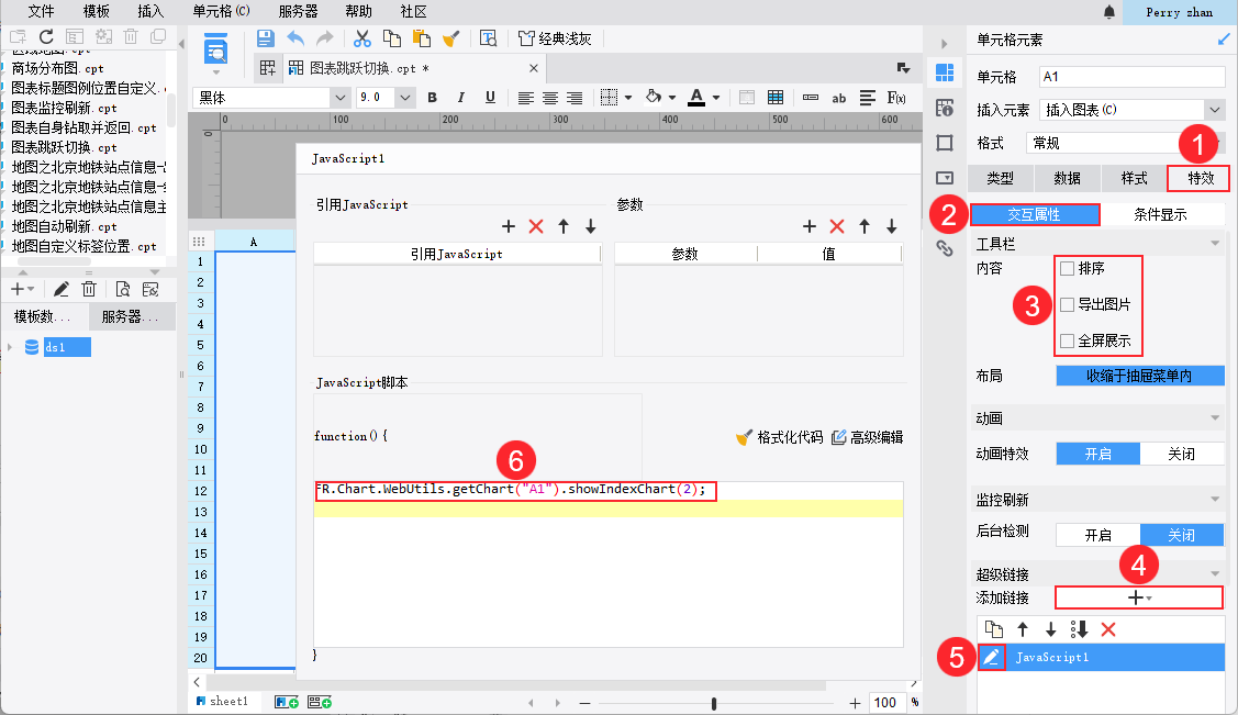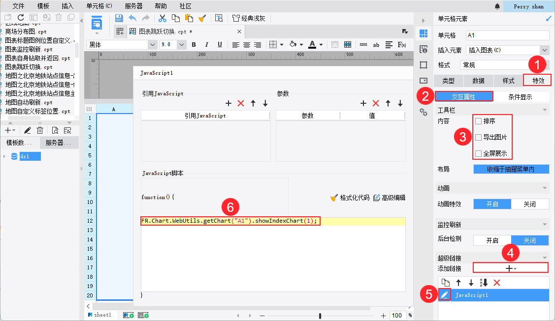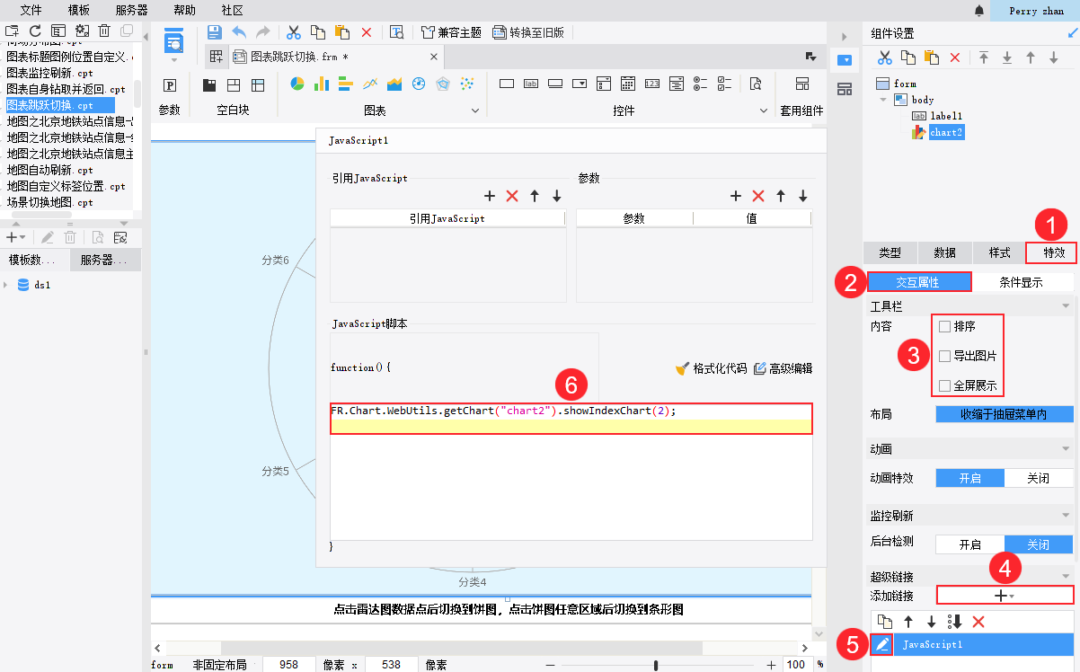 1)雷达图属性面板选择「特效>交互属性」,添加一个 JavaScript 类型的超级链接,决策报表需要将"A1"改成报表块名称"chart2"代码,JavaScript 代码如下: