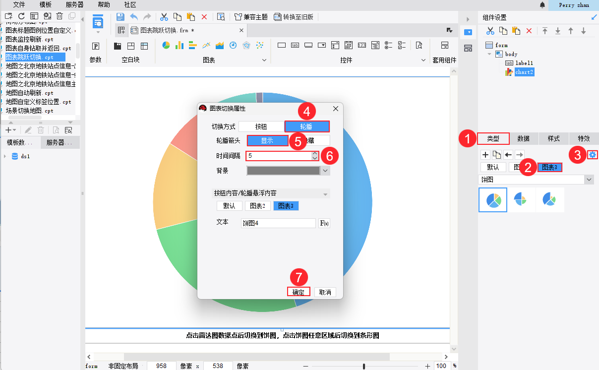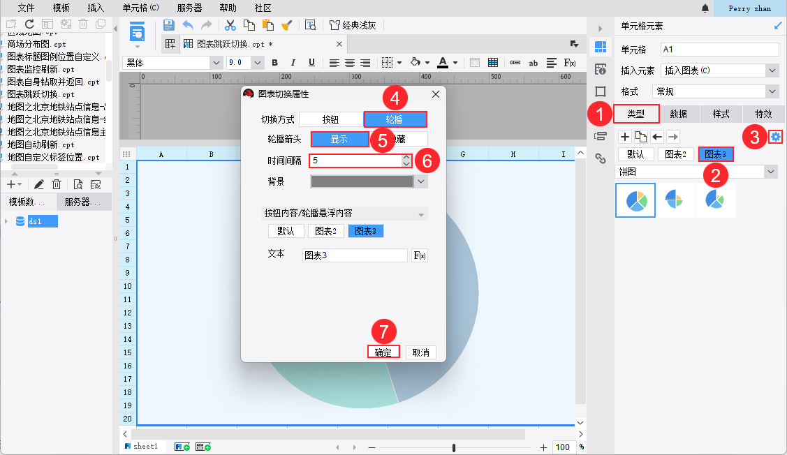 图表切换方式为「轮播」,「显示」轮播箭头,时间间隔设置为「5秒」,如下图所示: