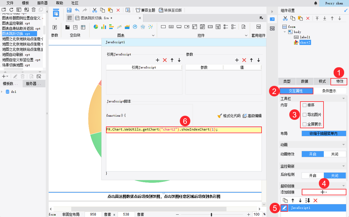 2)饼图属性面板选择「特效>交互属性」,添加一个 JavaScript 类型的超级链接,JavaScript 代码如下: