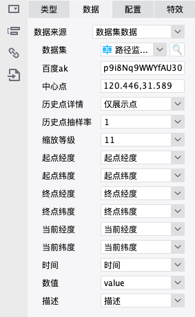 当前点和历史点数据都来自同一组字段 clat 和 clon ,所以数据集中数据建议以时间倒序排序,最新时间再最后一条(也就是当前点);之前的数据全是历史点。