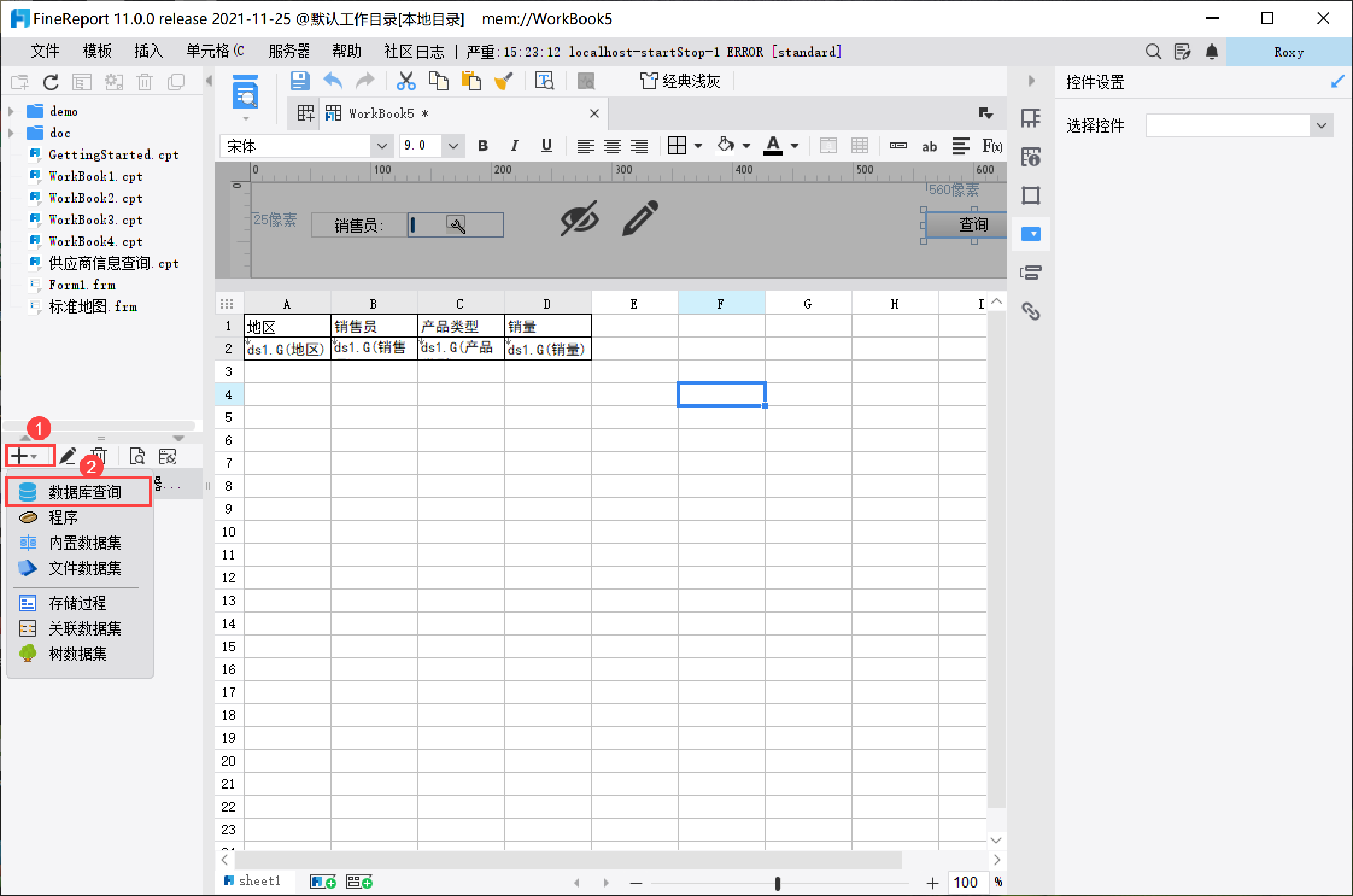 点击参数面板,将「销售员」参数添加并设置为文本控件,然后添加查询按钮,或者直接点击「全部添加」,如下图所示: