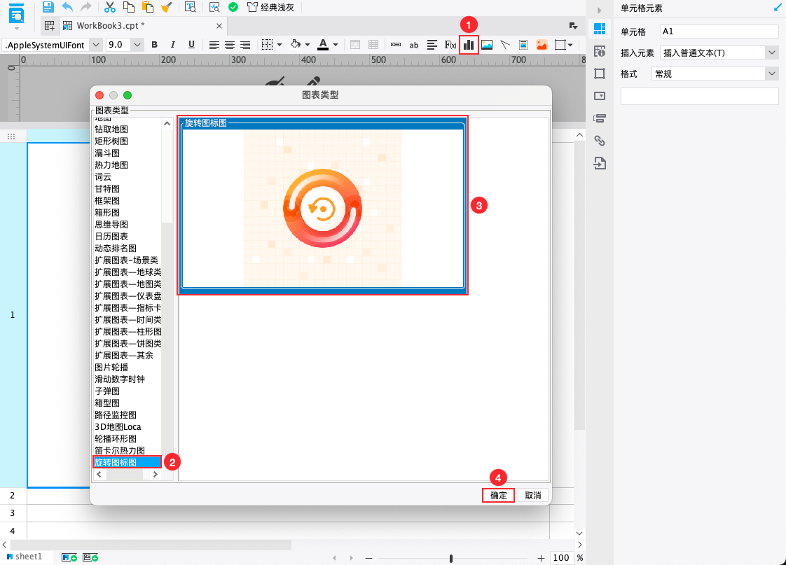 2)点击上方工具栏插入图表按钮,插入「旋转图标图」。如下图所示: