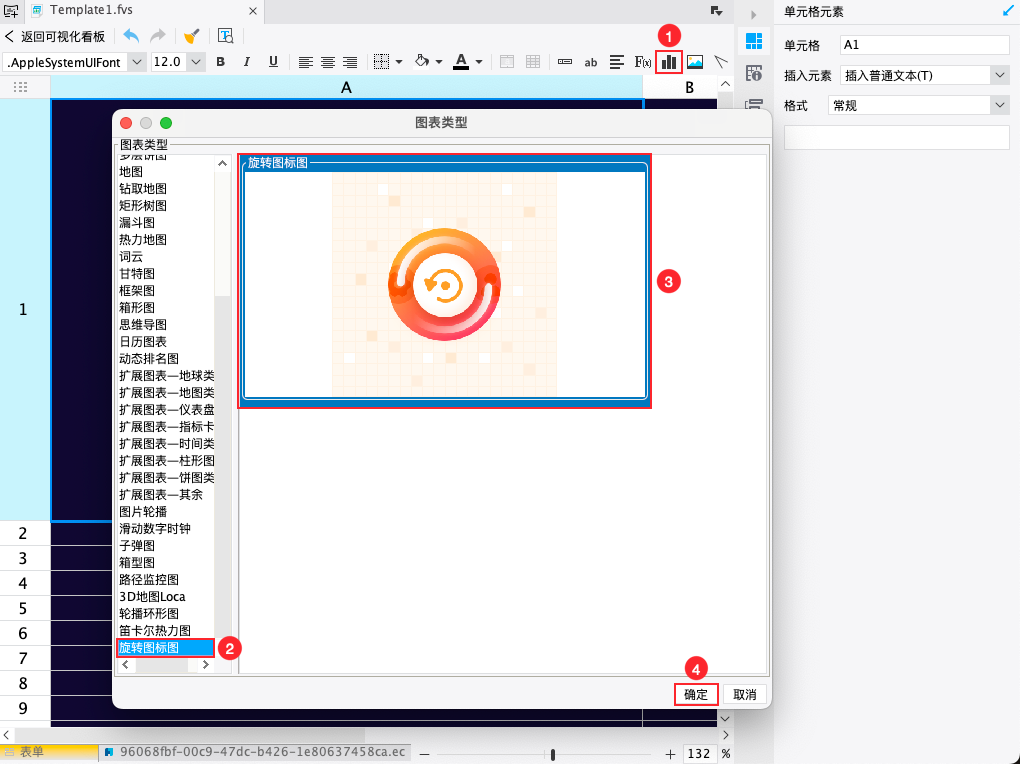 在 FVS 中添加表格组件。编辑表格,上方工具栏中选择插入图表,在图表类型窗口,选择「旋转图标图」,如下图所示: