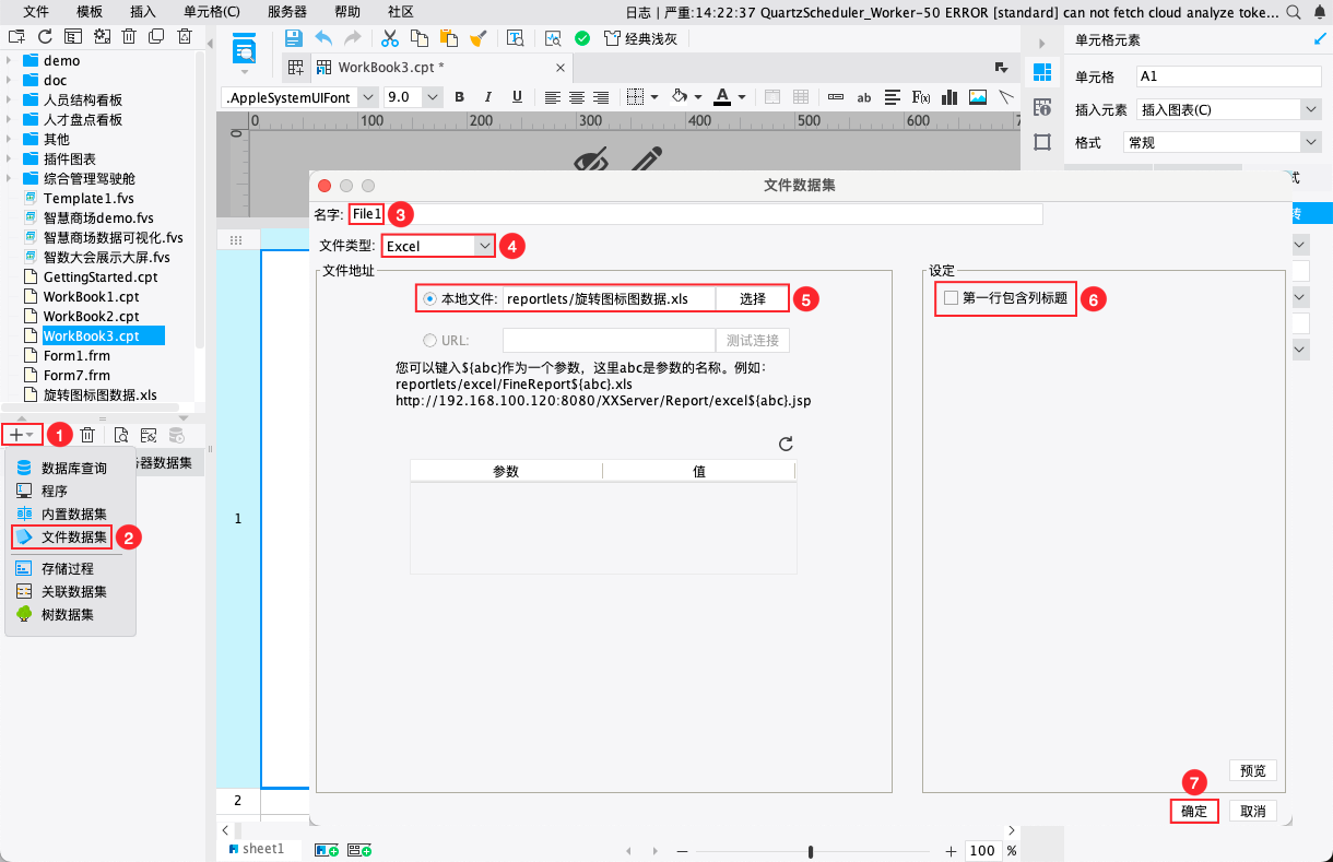 2)新建一个文件数据集 File1,文件类型设置为 Excel ,文件地址选择本地文件中的 旋转图标图数据.xls 文件,点击「确定」