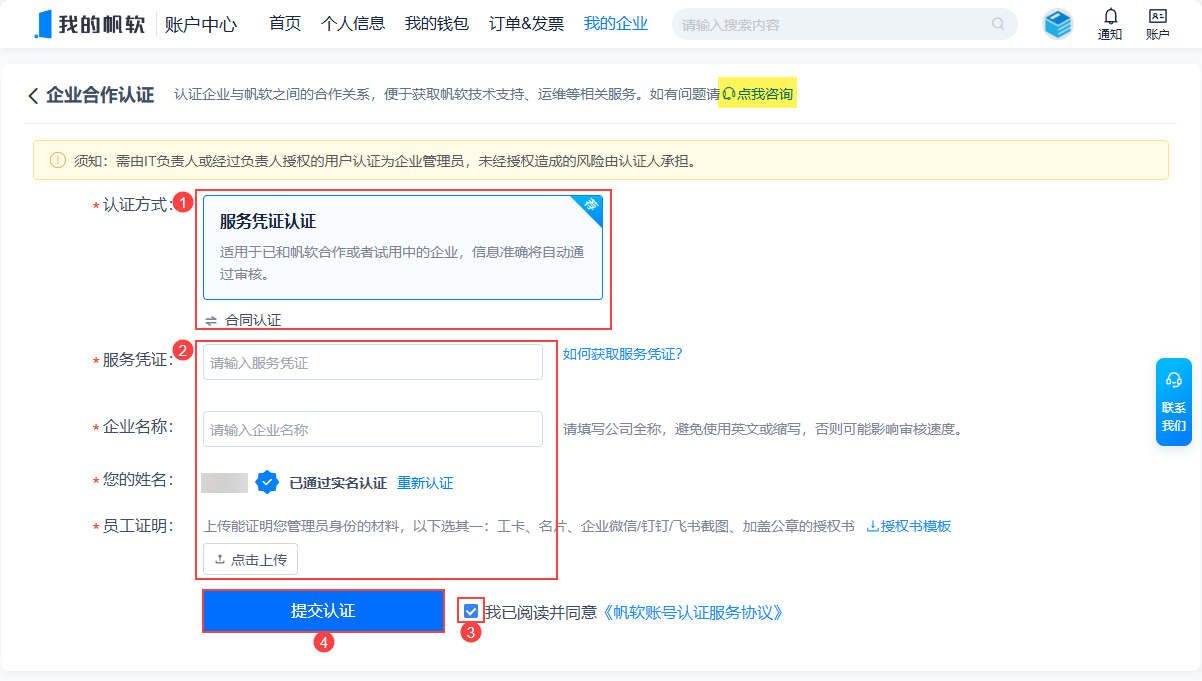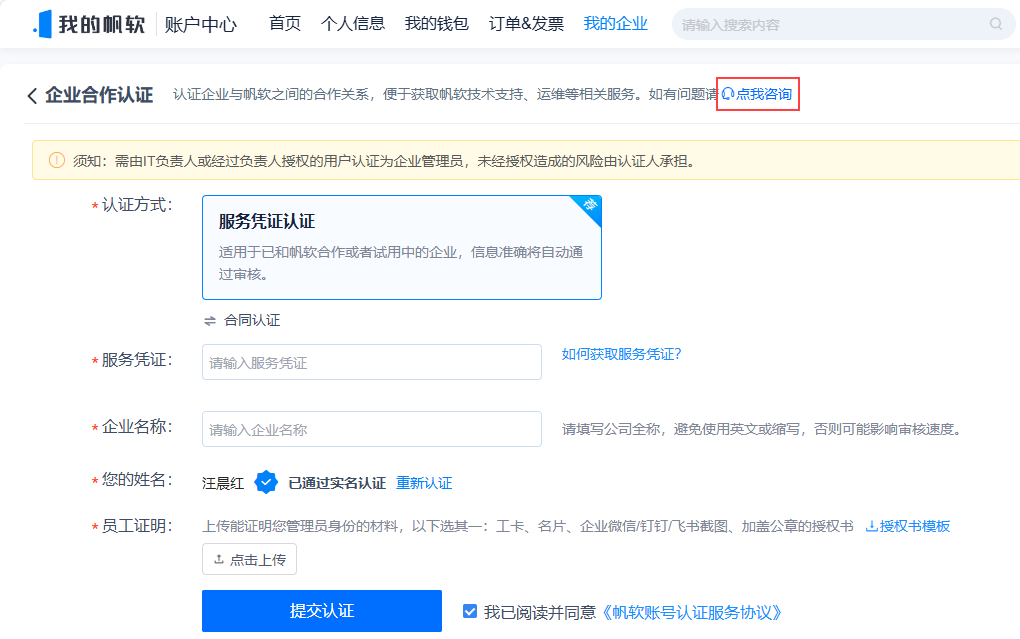 注:认证过程中,如遇到问题或有任何疑问,请点击页面右上角「点我咨询」。