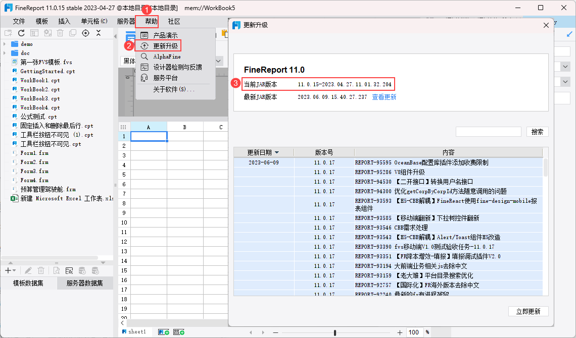 用户打开设计器,点击「帮助>更新升级」,在「当前JAR版本」处即可查看设计器的版本号。