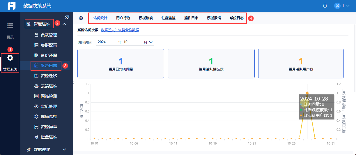 管理员登录FineReport系统,点击「管理系统>智能运维>平台日志」,可看到多项日志记录。