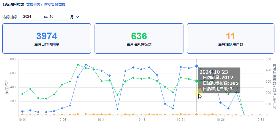 「系统访问次数」以指标卡和折线图的方式介绍系统访问量、被访问模板数、活跃客户数。