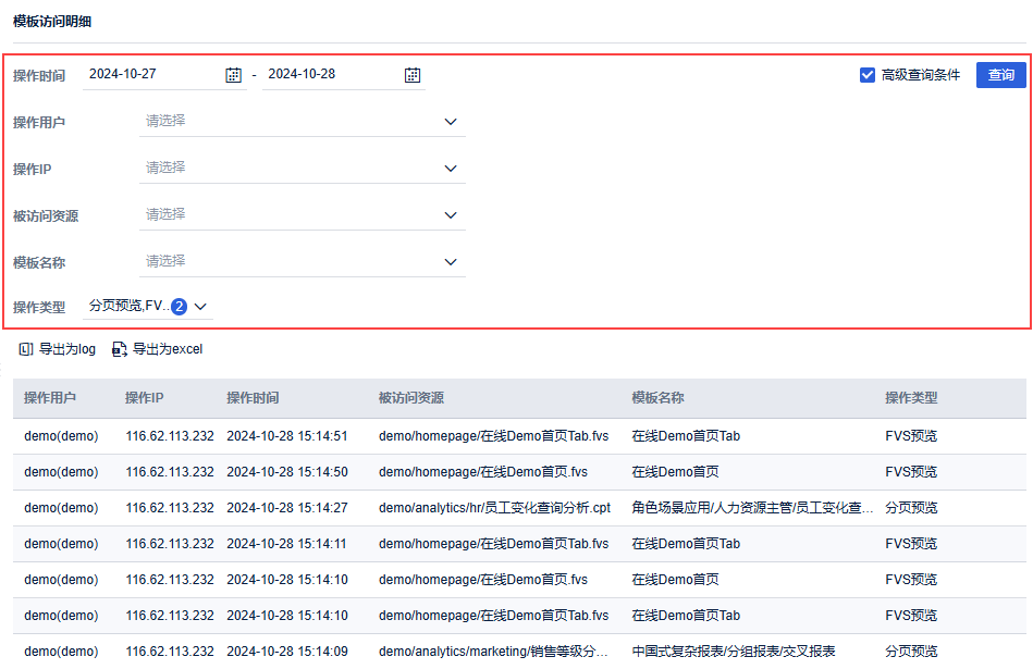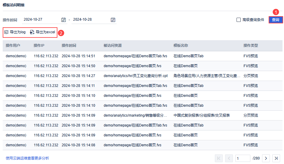详细介绍报表被访问时间,访问的 IP,操作(什么方式访问的报表如:分页预览、填报预览、数据分析等),角色(登录用户名的角色),用户名。