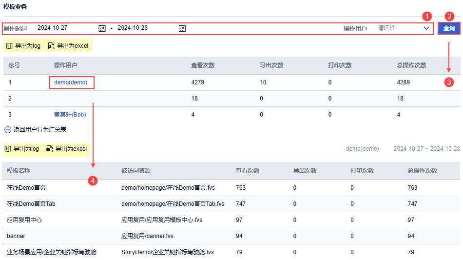 2)查询后,以明细表展示指定时间段内用户对模板的查看次数、导出次数、打印次数和总操作次数