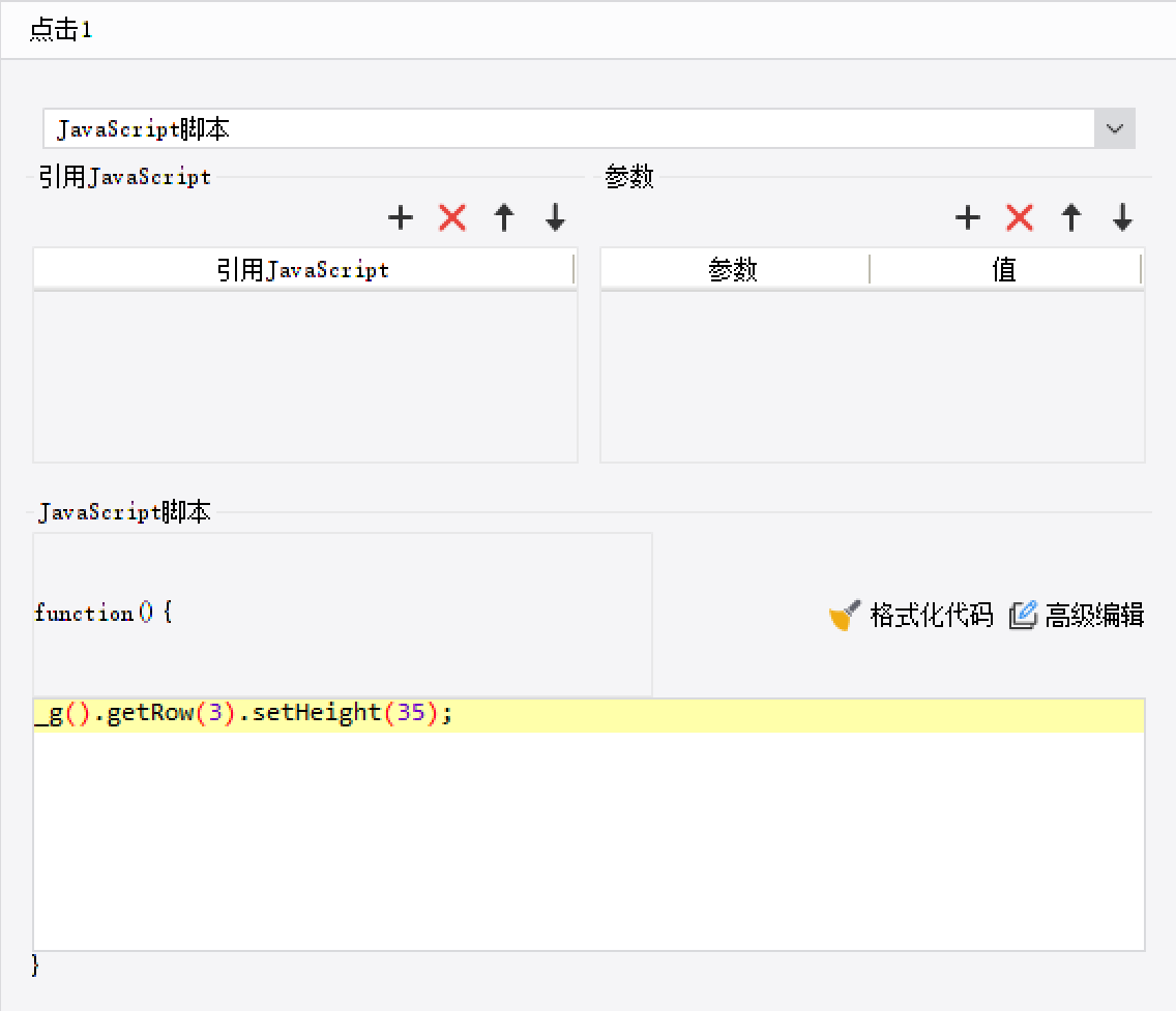 可以通过给指定行增加「加载结束」事件,或添加按钮控件,对按钮添加「点击事件」实现指定行改变行高。本文将以改变第 3 行的行高为 35,第 3 列的列宽为 60 ,为例进行说明。