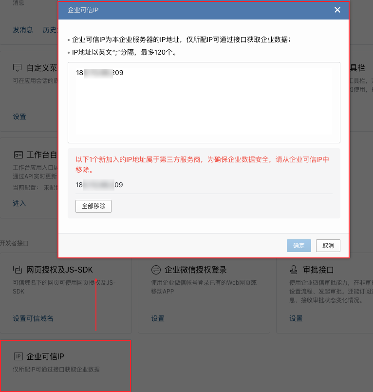 如果客户遇到添加 IP,提示是第三方服务商IP(实际不是),需要找企业微信客服验证一下企业可信IP,如下图所示: