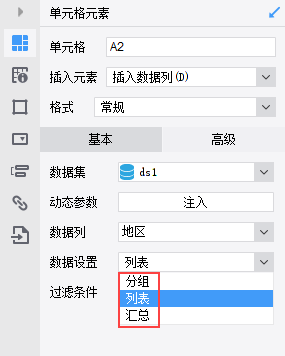 如上图,制作的报表展示出来的数据与数据集数据完全相同,即数据集中的每条记录无论是否重复都原封不动的展示出来,此为清单式明细列表。 在设计器中的设置方式如下: