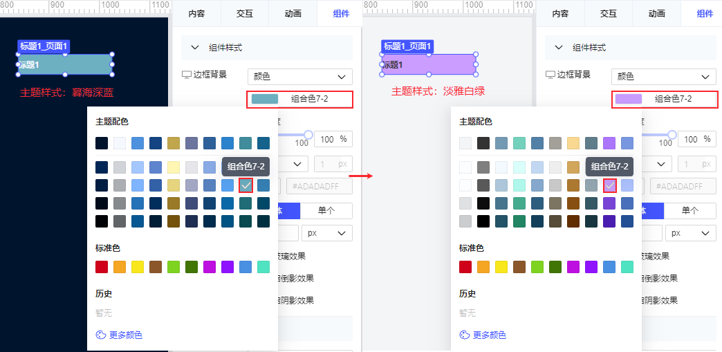 为模板配置了主题样式后,如果需要修改组件的配色,可直接使用主题配色中的颜色进行快速调整,从而迅速适配模板的整体风格 「图表」组件的「组件样式」、「其他」组件若选择了「主题配色」中的颜色,切换主题样式后,主题配色跟随主题样式变化。如下图所示: 注:「图表」组件的「内容」设置、「控件」不支持上述变化。若选择了主题配色,切换主题样式后,变为主题样式中设置的默认色。