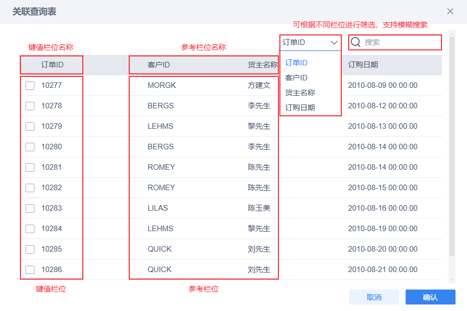 为此,我们可以通过设置关联查询控件插件,利用「客户ID」和「订购时间」等字段,来筛选出所需的「订单ID」。
