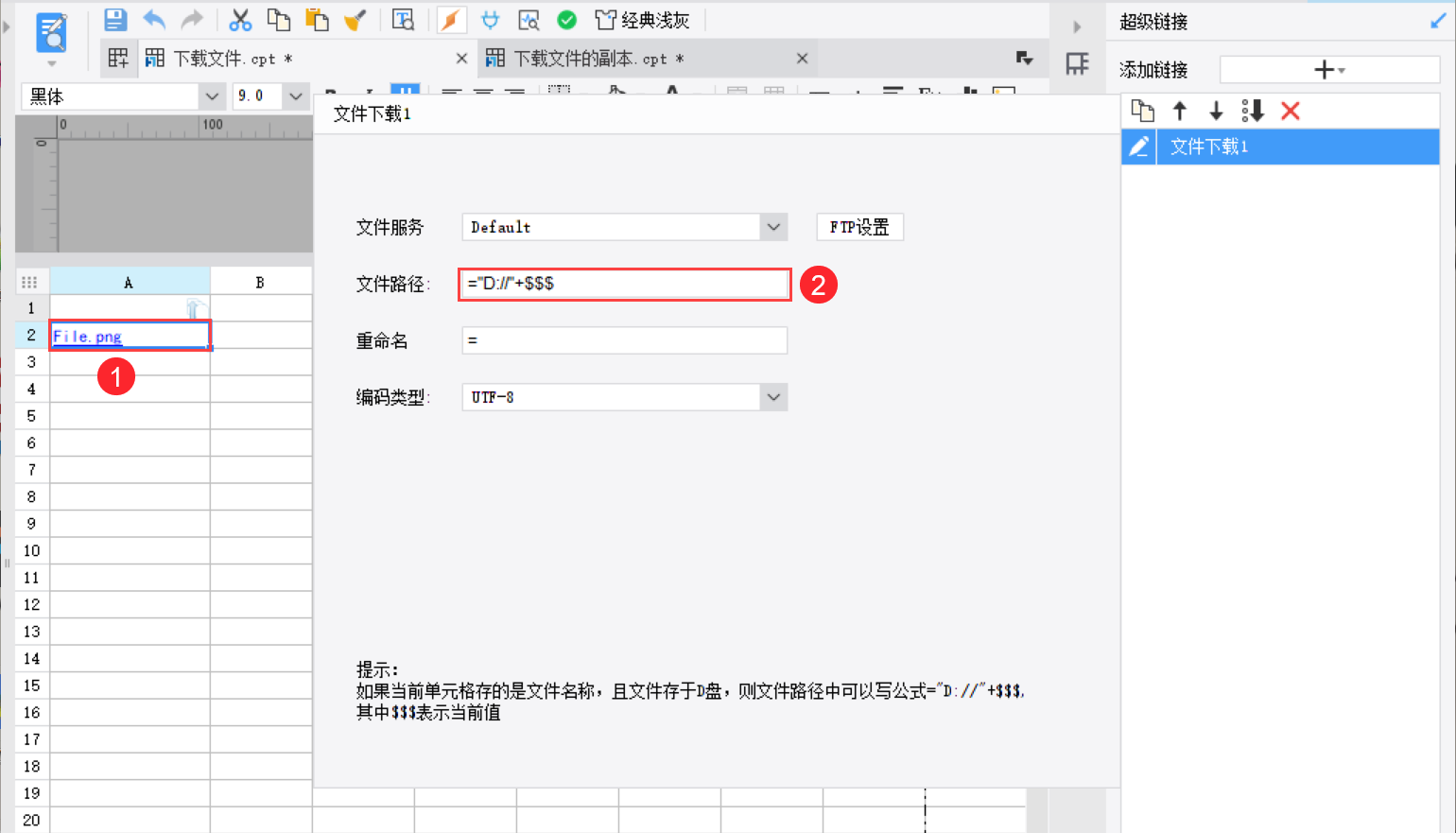 注2:文件名称为公式时,文件路径不能直接写公式"D://"+$$$,应该写为:"D://"+表示文件名称的公式。如下图所示: