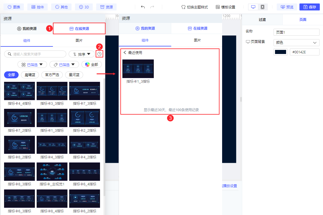 2)页面背景、组件边框背景、图片组件 等可以使用图片资源的地方,支持选择「资源中心>在线资源」中的图片使用,根据不同的功能默认存在标签筛选。