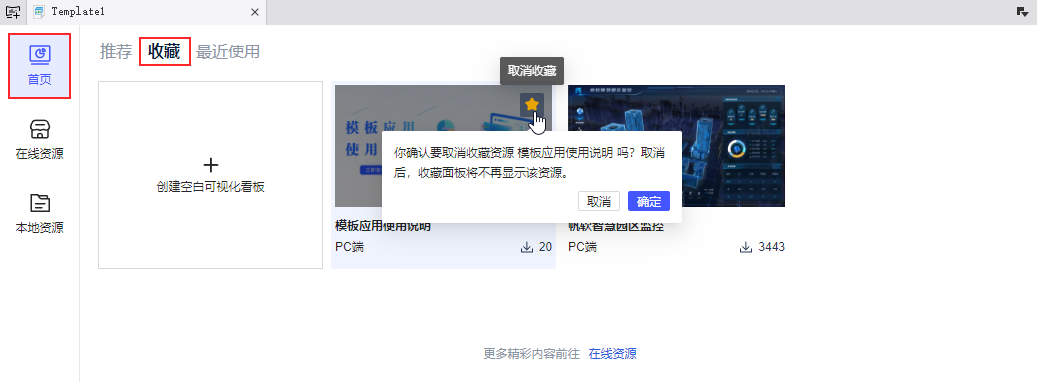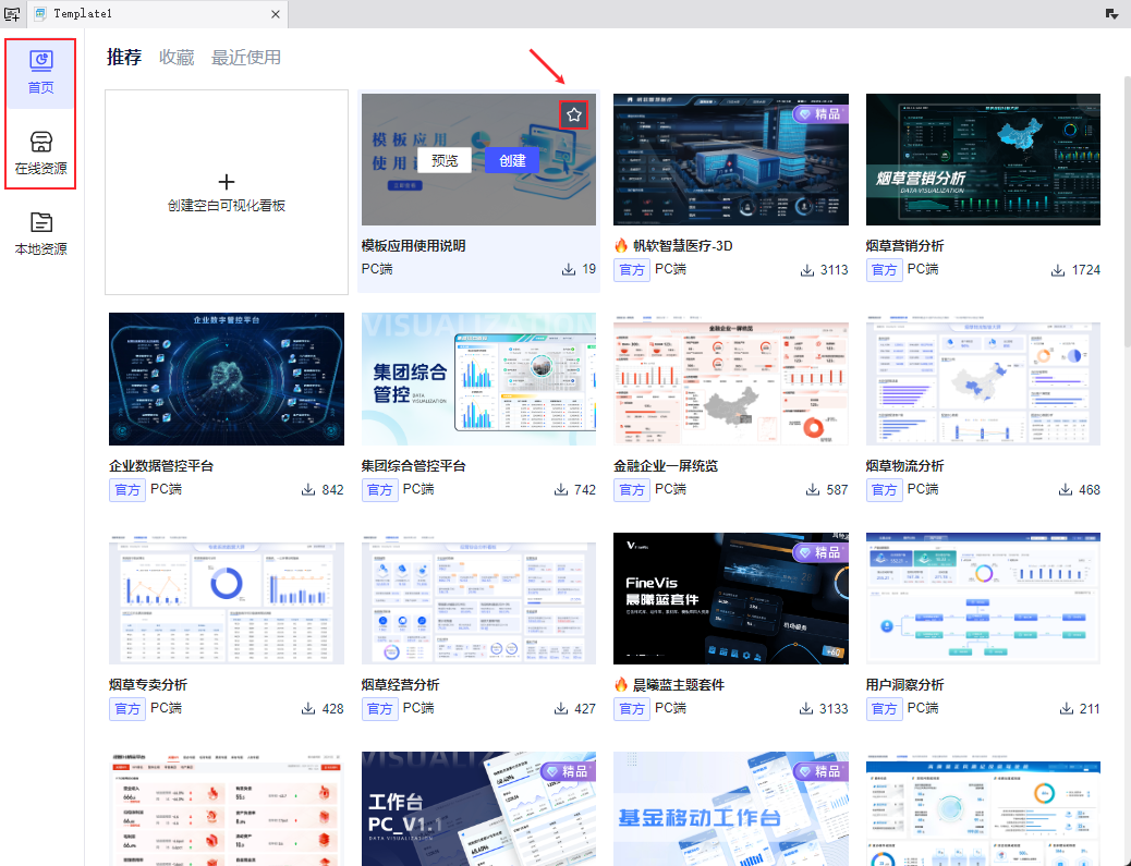新建可视化看板时,可在「首页」中选择模板资源,或「在线资源」中根据需要的行业或业务标签筛选模板资源。