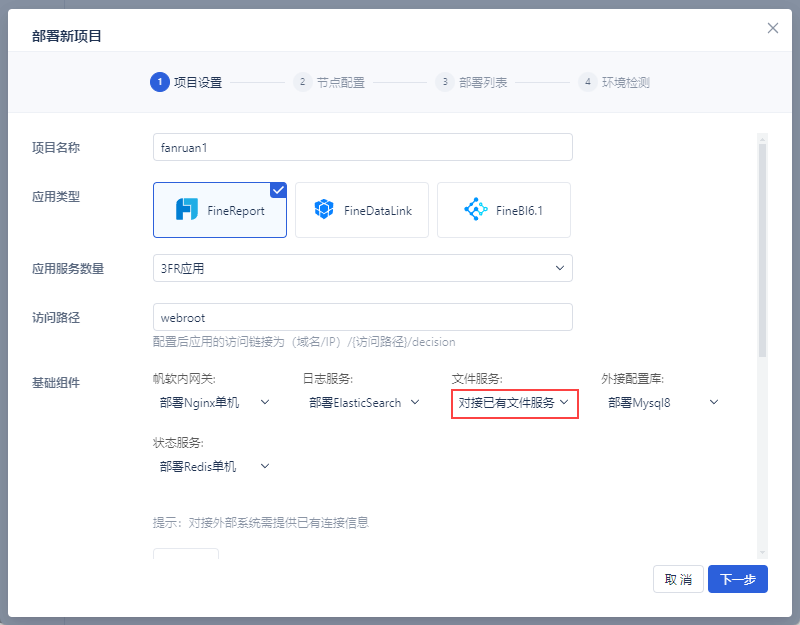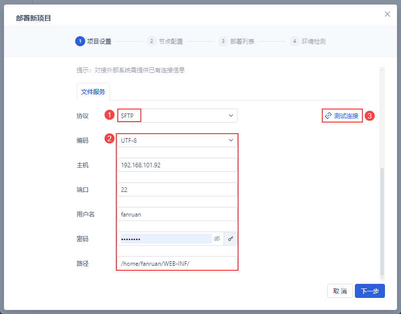 在「部署新项目-项目设置」时,可接入自备的SFTP作为集群文件服务。