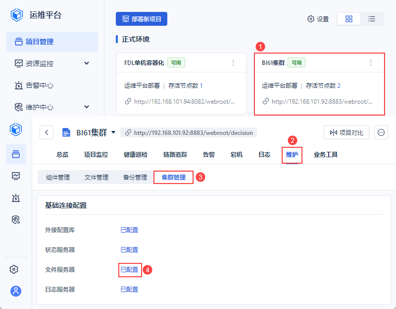 2)点击「维护>集群管理」,对「文件服务器」进行配置。