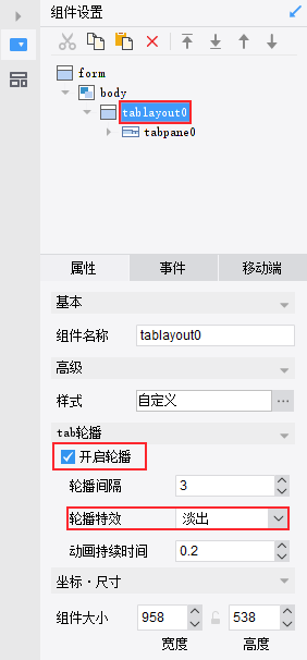 点击左侧控件设置,打开tab布局属性界面,如下图: