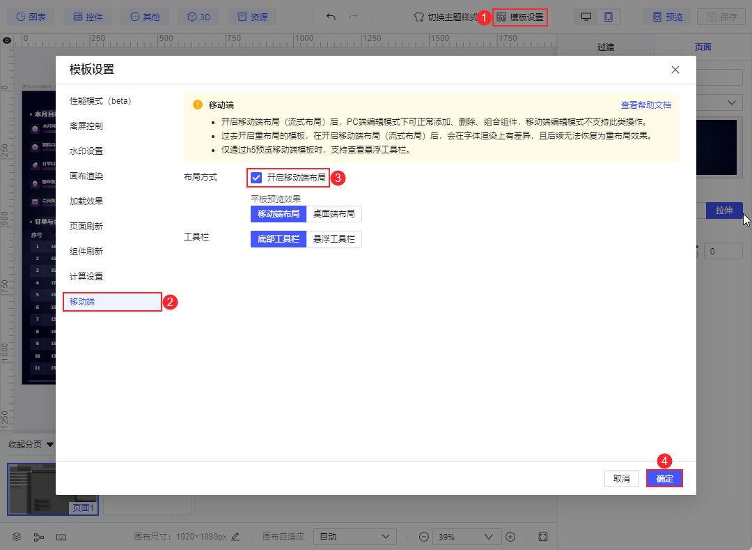 打开 PC 端模板,点击「模板设置>移动端」,勾选「开启 移动端布局 」。如下图所示: