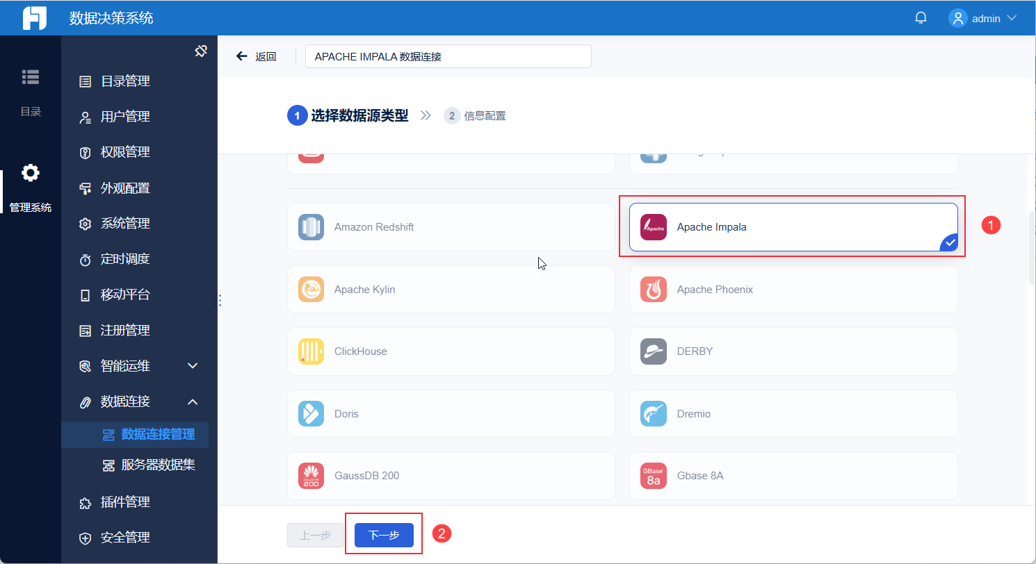 注:如果非管理员用户想要配置数据连接,需要管理员给其分配管理系统下数据连接节点的权限,具体操作请查看 数据连接权限