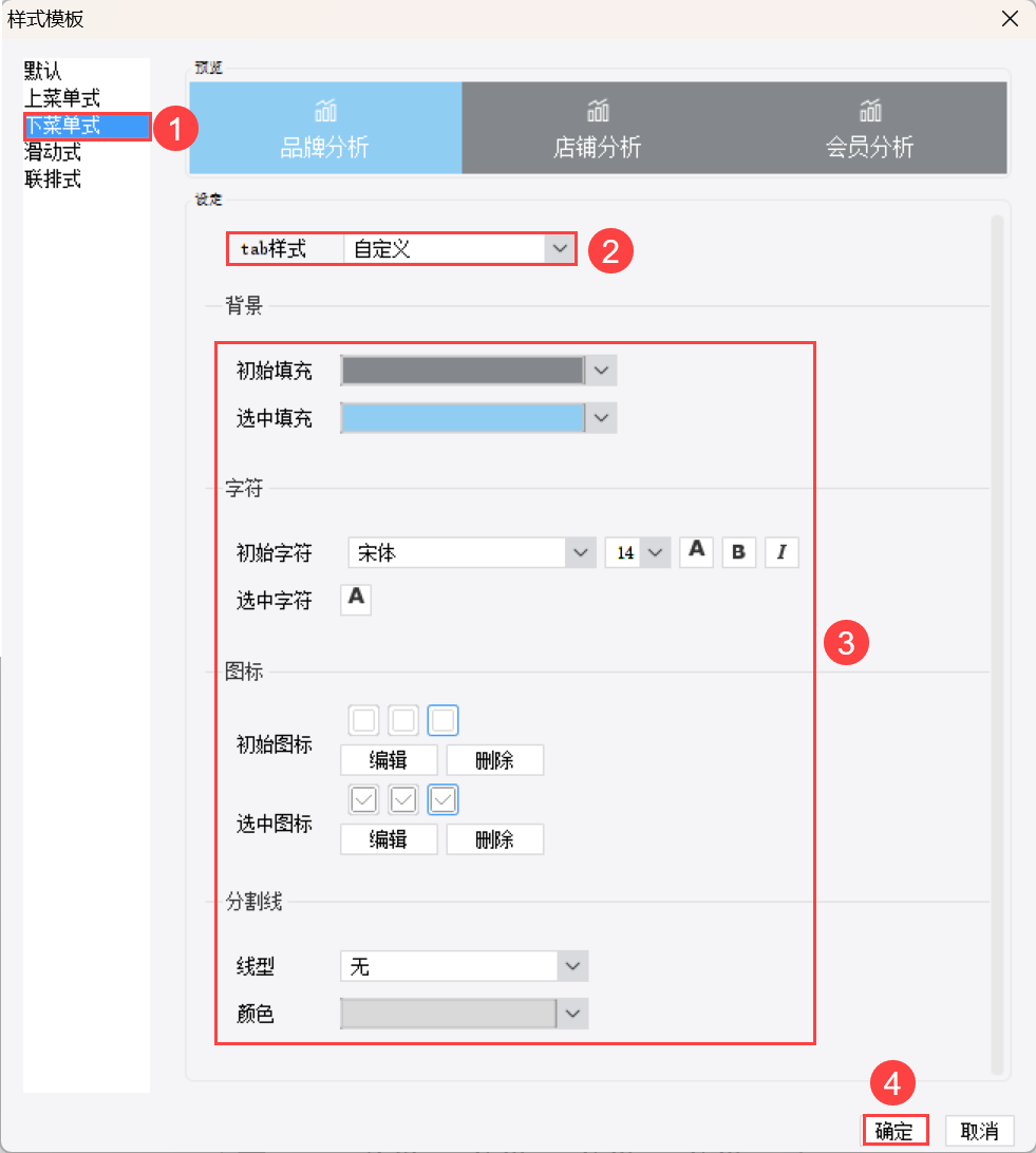 1)样式模板 选择「下菜单式」,Tab 样式 选择「自定义」。