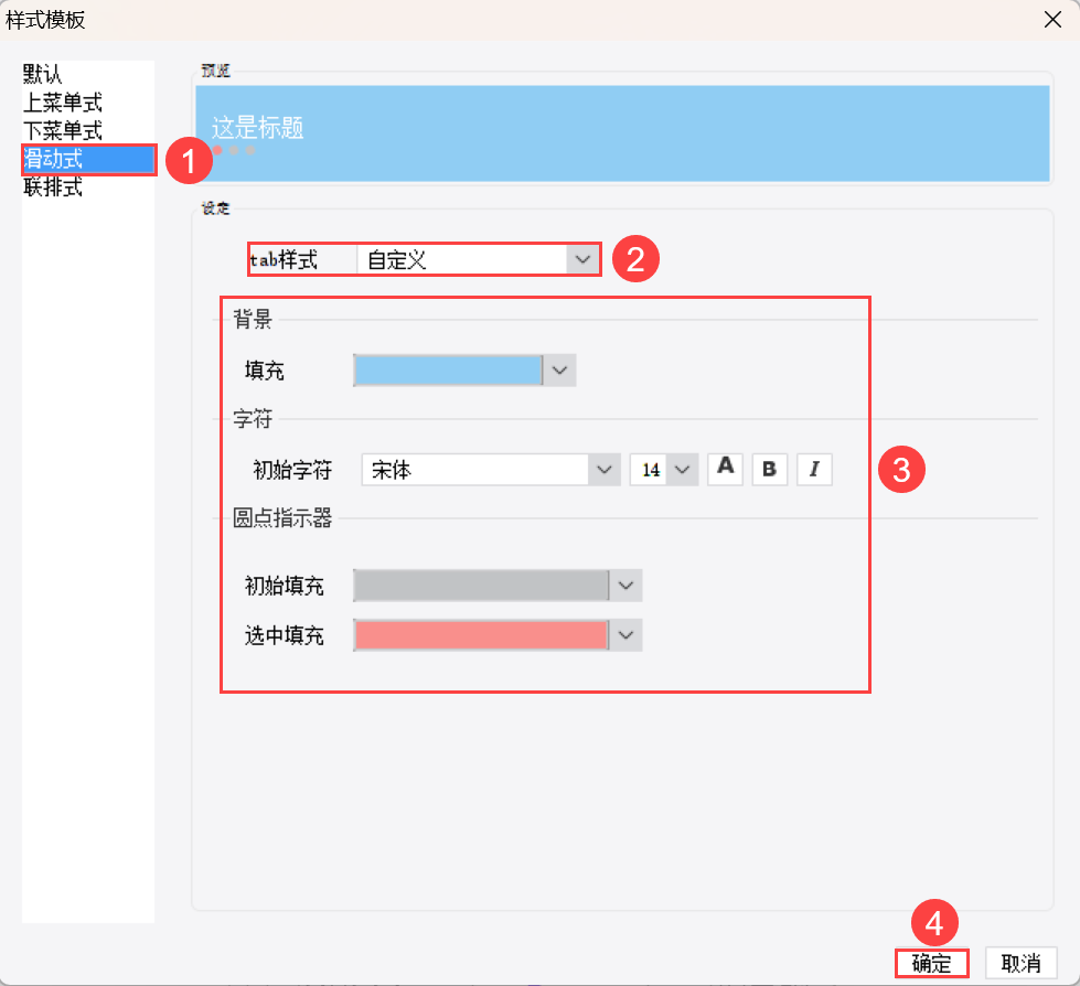 1)样式模板 选择「滑动式」,Tab 样式 选择「自定义」。