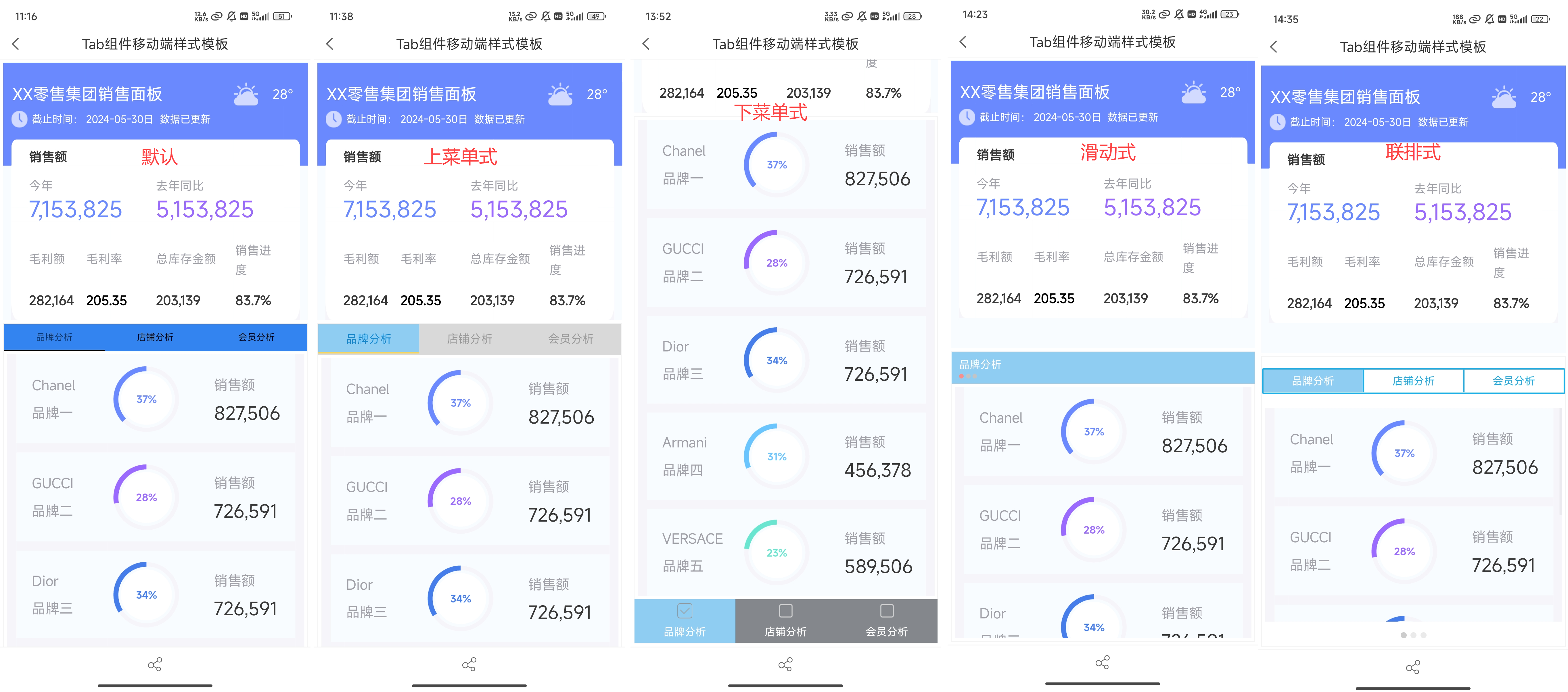 注:5 类移动端样式模板下, Tab 内图表块、报表块组件内部不支持上下左右滑动,不支持放大。