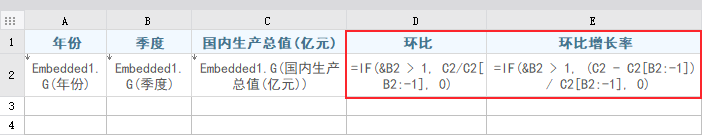 | IF(&B2 > 1, C2 / C2[B2:-1], 0) | 表示若不是第一季度,环比为当前季度的国内生产总值/上一季度的国内生产总值,否则,环比为 0 |