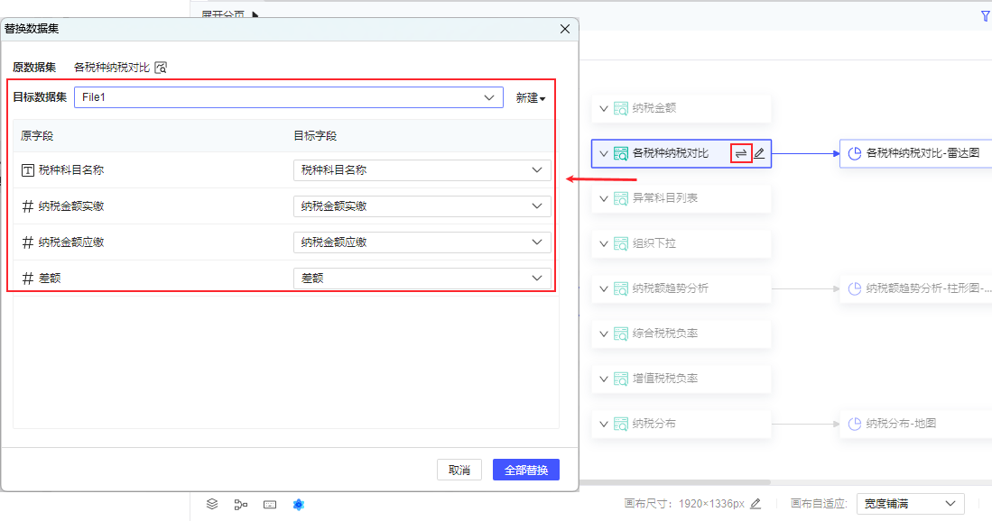 1)替换后,画布内组件实时生效,原数据集仍保留在数据集列表中。